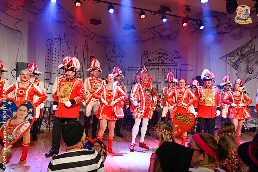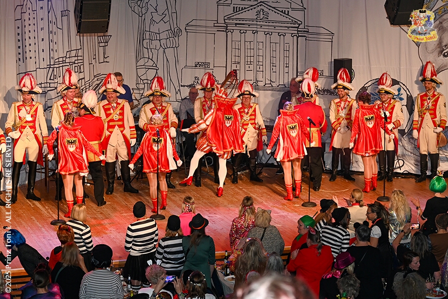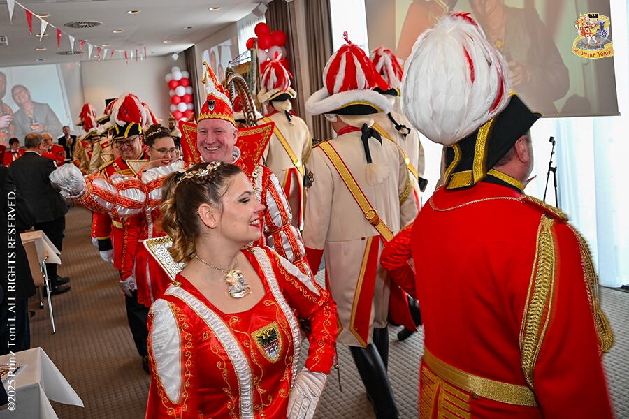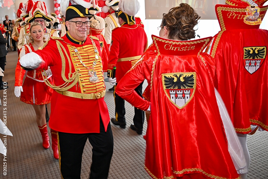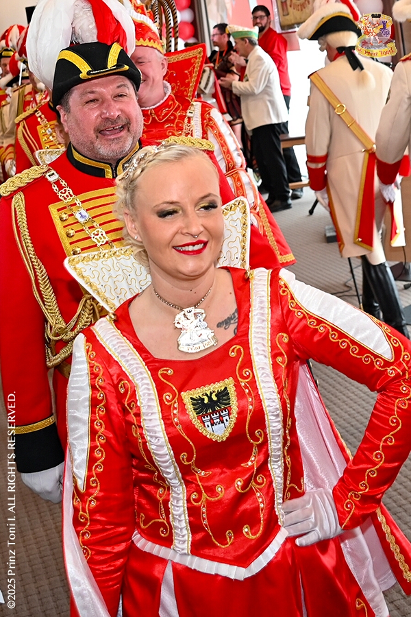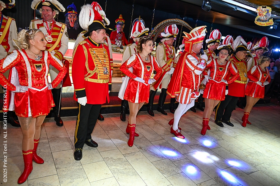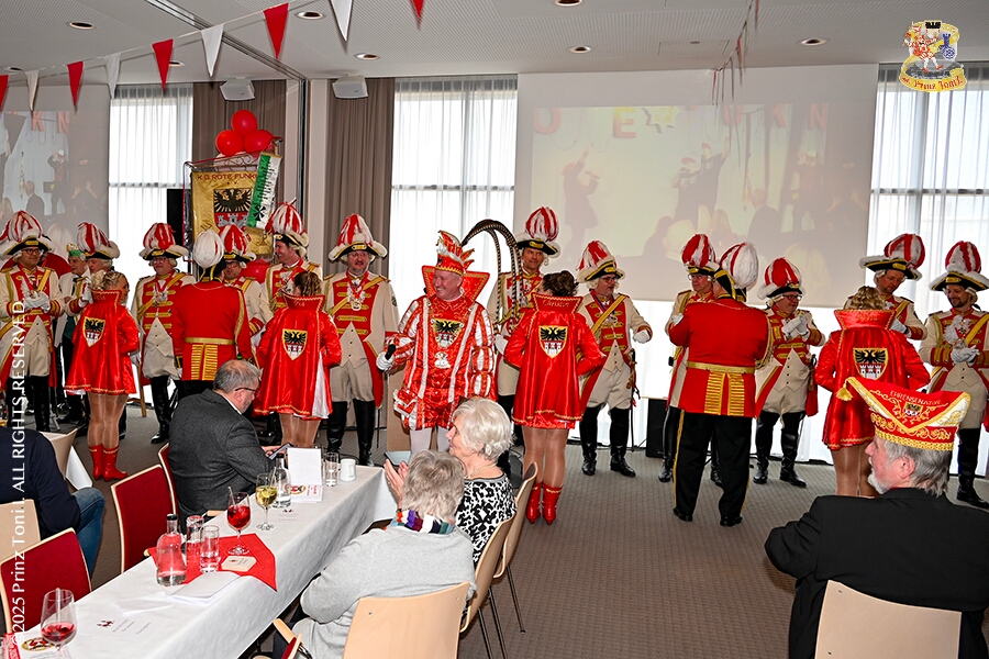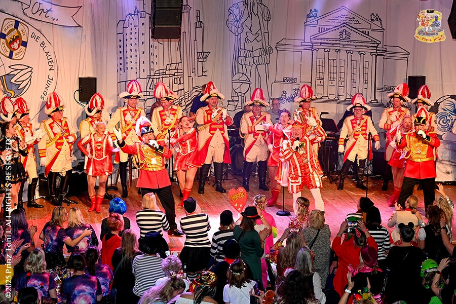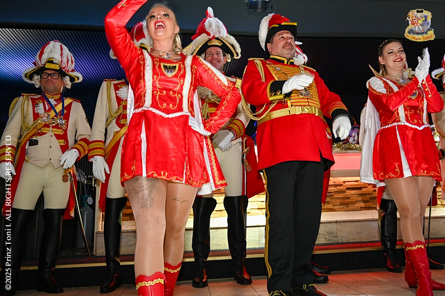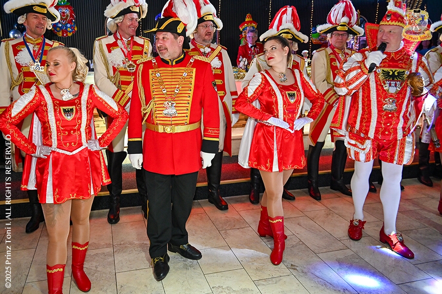 25 Tour-Tag, 1. Februar - Im Intercity Hotel feierten die Roten Funken ihr 77-jähriges Bestehen an diesem Sonntagmorgen, auch wir gratulierten. Auf zum Heimspiel für unsere Christin hieß es danach, dies bei der Damensitzung der » Blauen Jungs «. Eine große Kinderschar erwartete uns dann im Steinhof. Die Musketiere hielten dort ihre Kindersitzung ab. In die Rheinhausenhall führte uns dann der nächste Termin, Damensitzung von Rot-Weiß. Zum Schluß erwartete und die SPD Großenbaum/Rahm bei ihrem „Tanztee“ in unserem Stadquartier, dem Coupe 1900.
