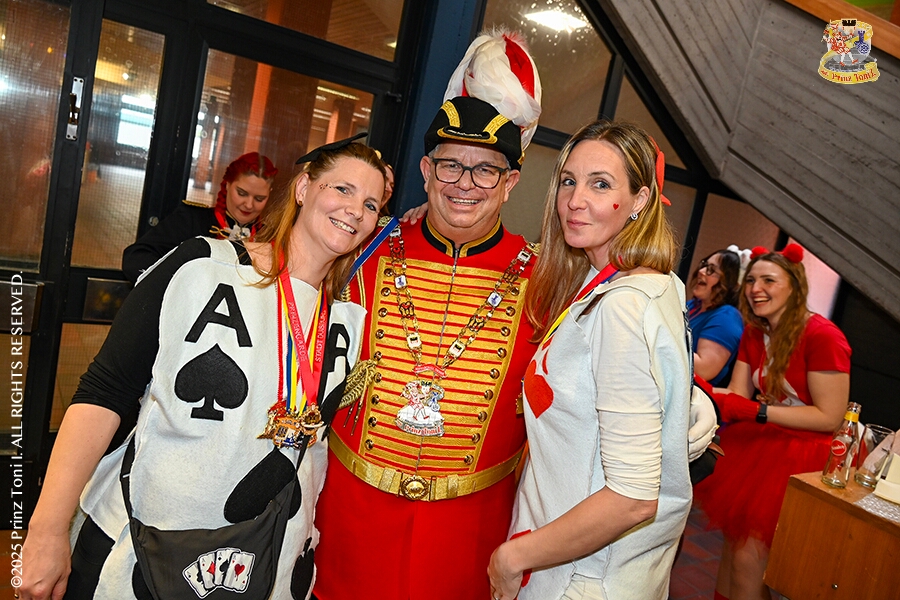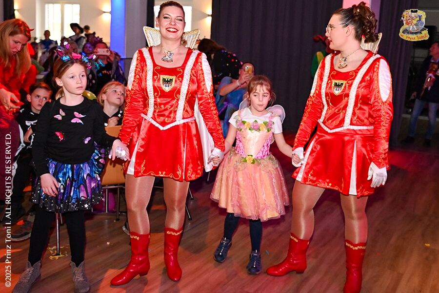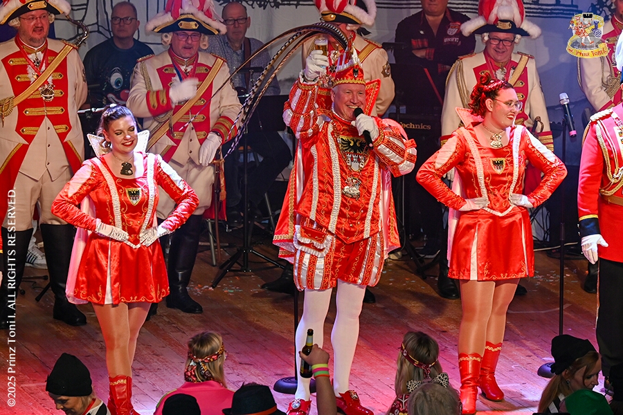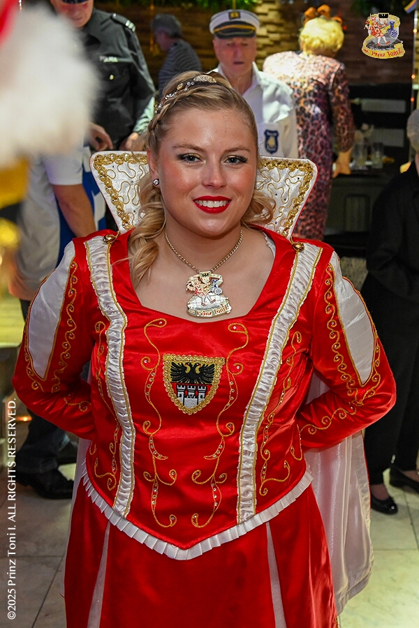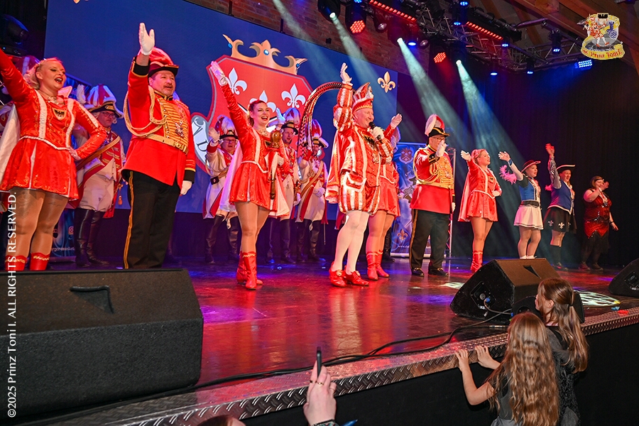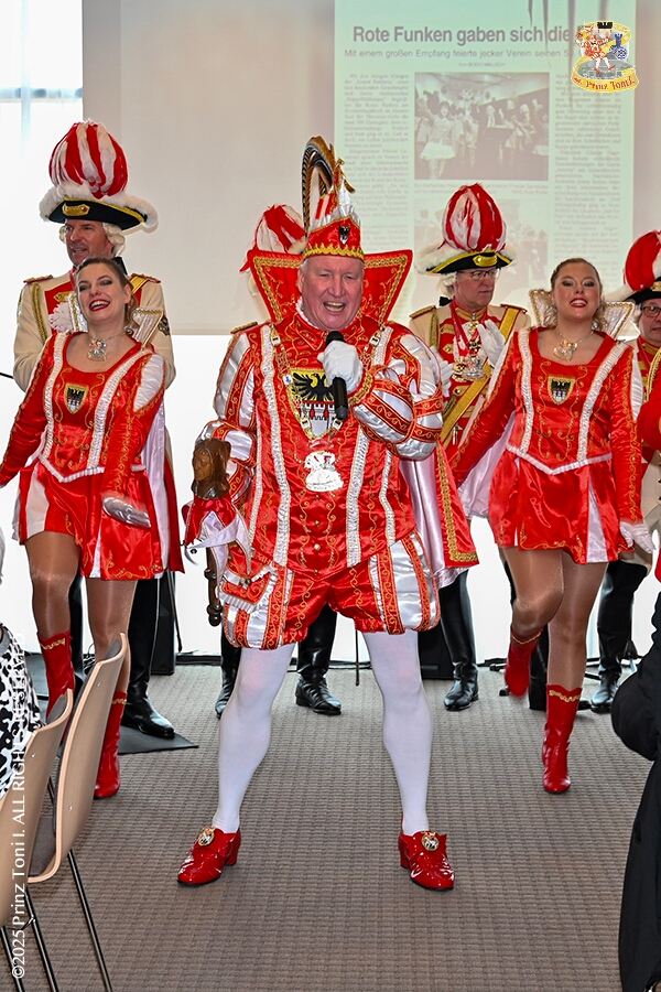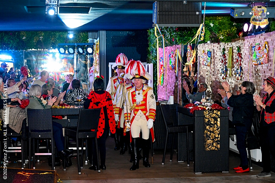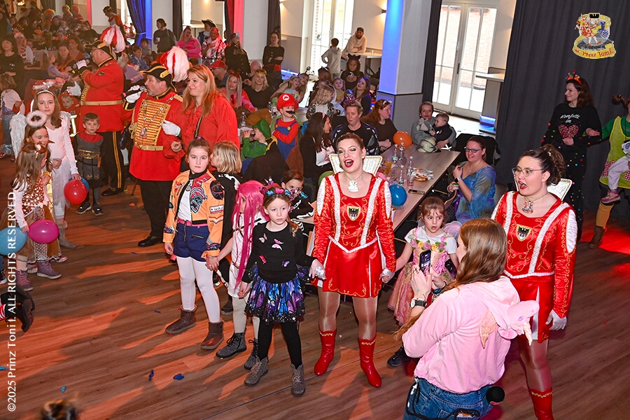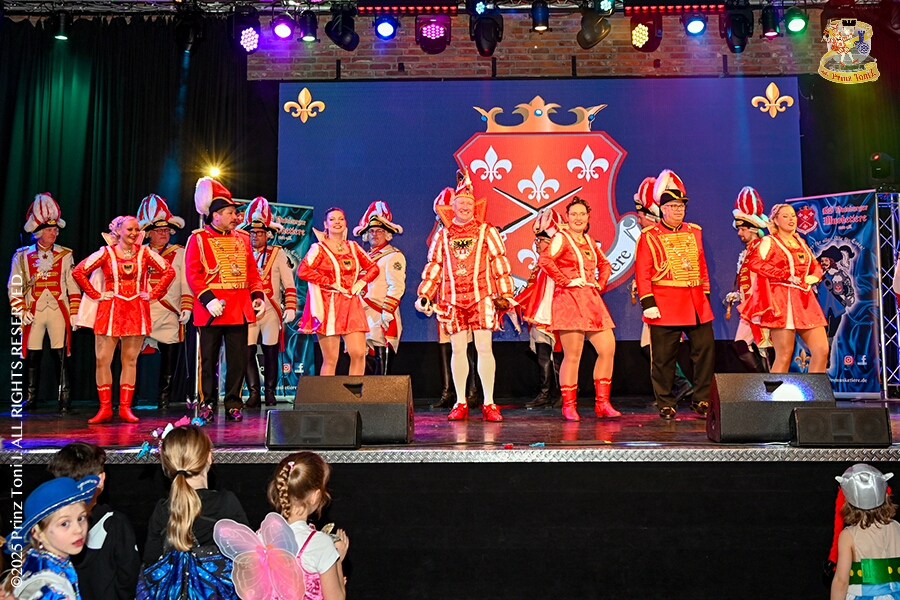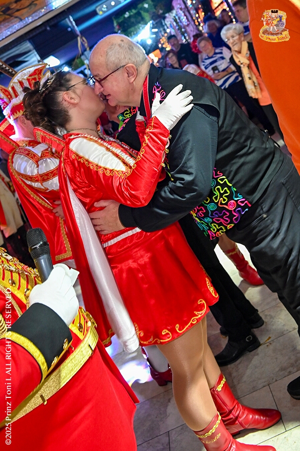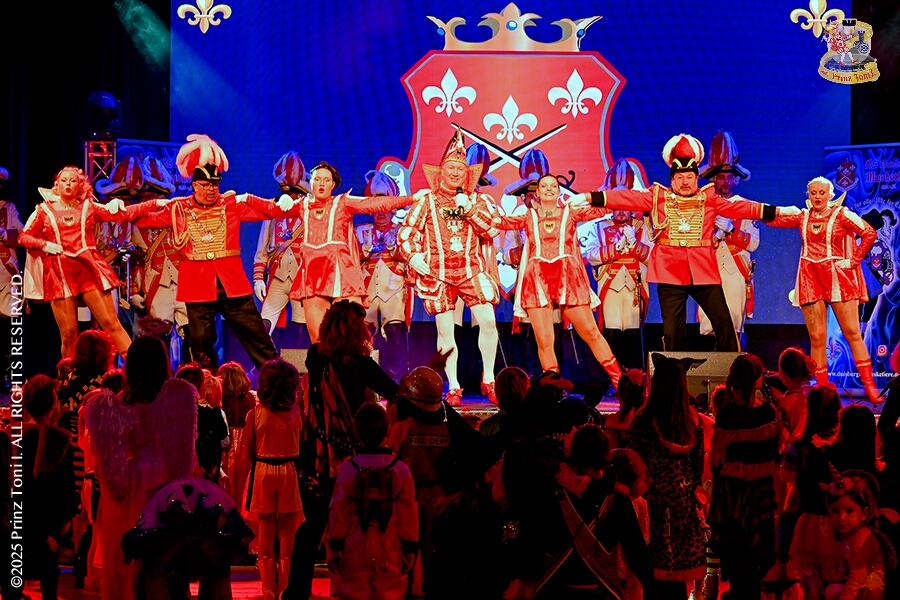 25 Tour-Tag, 1. Februar - Im Intercity Hotel feierten die Roten Funken ihr 77-jähriges Bestehen an diesem Sonntagmorgen, auch wir gratulierten. Auf zum Heimspiel für unsere Christin hieß es danach, dies bei der Damensitzung der » Blauen Jungs «. Eine große Kinderschar erwartete uns dann im Steinhof. Die Musketiere hielten dort ihre Kindersitzung ab. In die Rheinhausenhall führte uns dann der nächste Termin, Damensitzung von Rot-Weiß. Zum Schluß erwartete und die SPD Großenbaum/Rahm bei ihrem „Tanztee“ in unserem Stadquartier, dem Coupe 1900.