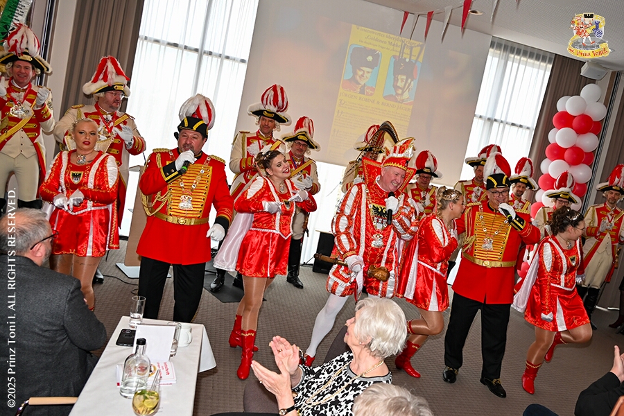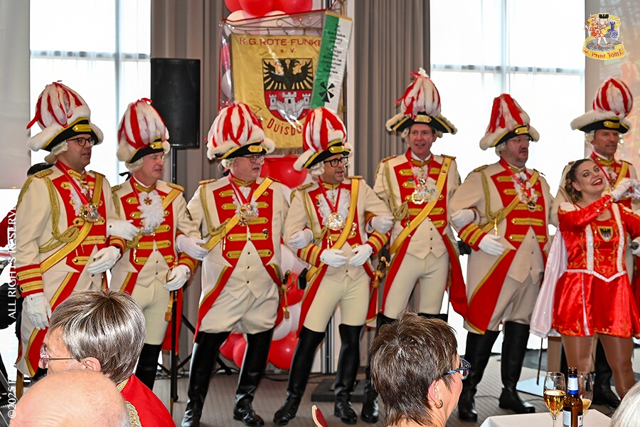 Im Intercity Hotel feierten die Roten Funken ihr 77-jähriges Bestehen an diesem Sonntagmorgen, auch wir gratulierten. Auf zum Heimspiel für unsere Christin hieß es danach, dies bei der Damensitzung der » Blauen Jungs «. Eine große Kinderschar erwartete uns dann im Steinhof. Die Musketiere hielten dort ihre Kindersitzung ab. In die Rheinhausenhall führte uns dann der nächste Termin, Damensitzung von Rot-Weiß. Zum Schluß erwartete und die SPD Großenbaum/Rahm bei ihrem „Tanztee“ in unserem Stadquartier, dem Coupe 1900.