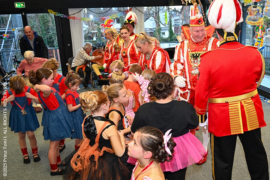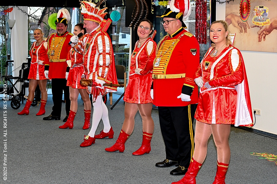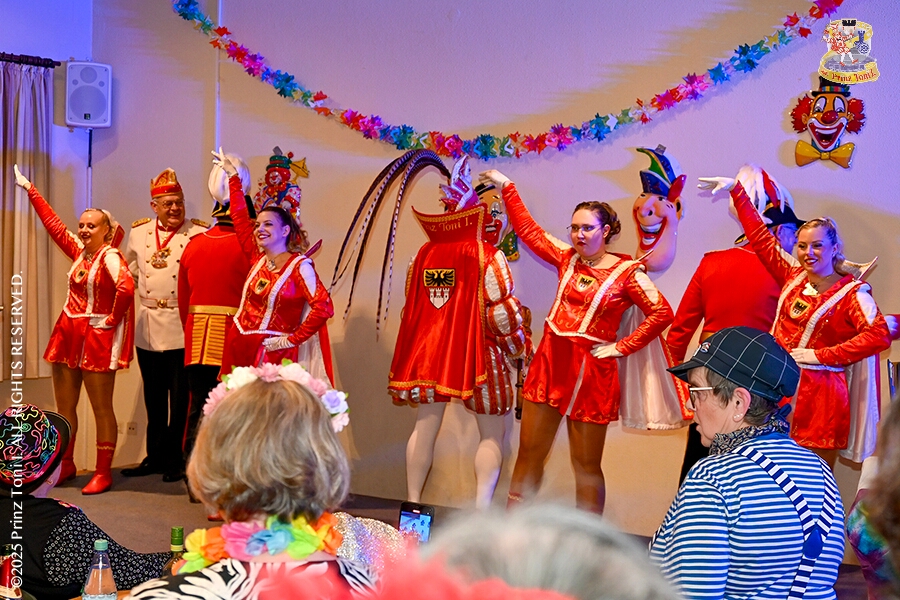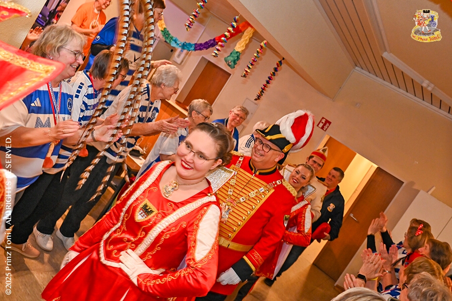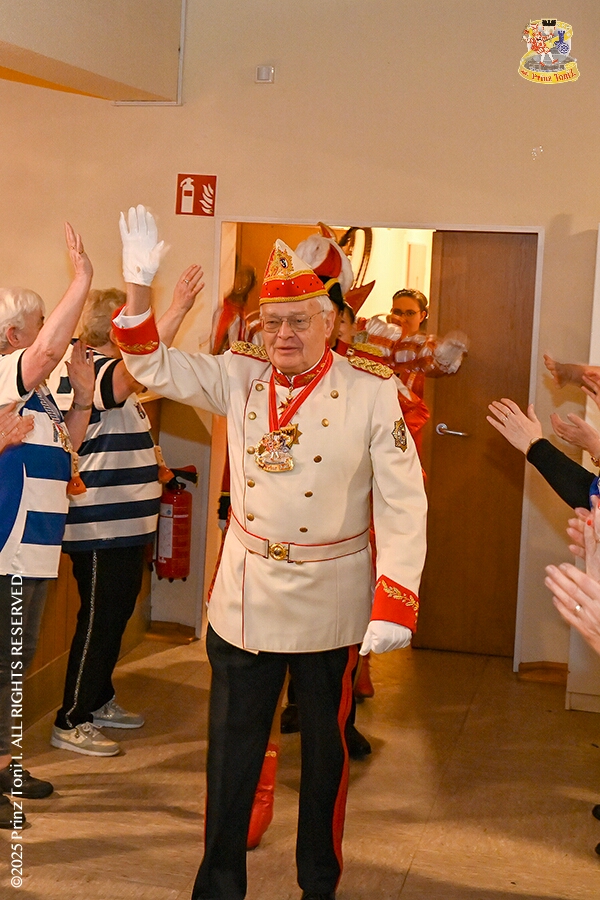6 Seniorenkarneval und Flüstersitzung - An Nachmittag des 4. Februar führte uns der erste Termin in das DRK-Multikulturelle Seniorenzentrum Haus am Sandberg in Homberg. Zum 2. Termin musste wir in den Süden. In Huckingen feierte die KFD St. Peter und Paul Gemeinde ihren 2. karnvalistischen Nachmittag, Toni I. wurde ein Superstar empfangen. Gestärkt mit ausreichend Kuchen und Kaffee ging es dann nach Walsum. In Open Rheins „Zum Johanniter“ , dort fand die „Flüstersitzung“ der Prinzengarde statt.