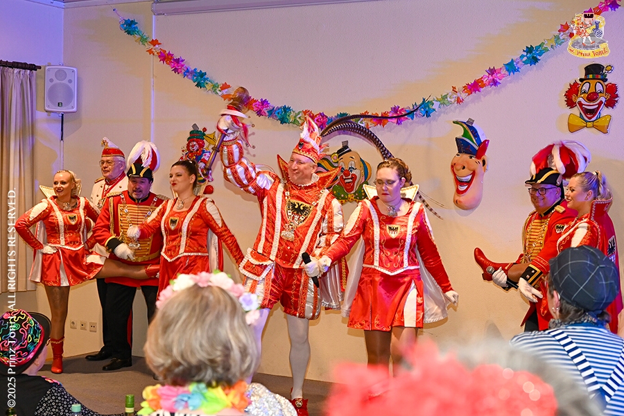 2 Seniorenkarneval und Flüstersitzung - An Nachmittag des 4. Februar führte uns der erste Termin in das DRK-Multikulturelle Seniorenzentrum Haus am Sandberg in Homberg. Zum 2. Termin musste wir in den Süden. In Huckingen feierte die KFD St. Peter und Paul Gemeinde ihren 2. karnvalistischen Nachmittag, Toni I. wurde ein Superstar empfangen. Gestärkt mit ausreichend Kuchen und Kaffee ging es dann nach Walsum. In Open Rheins „Zum Johanniter“ , dort fand die „Flüstersitzung“ der Prinzengarde statt.