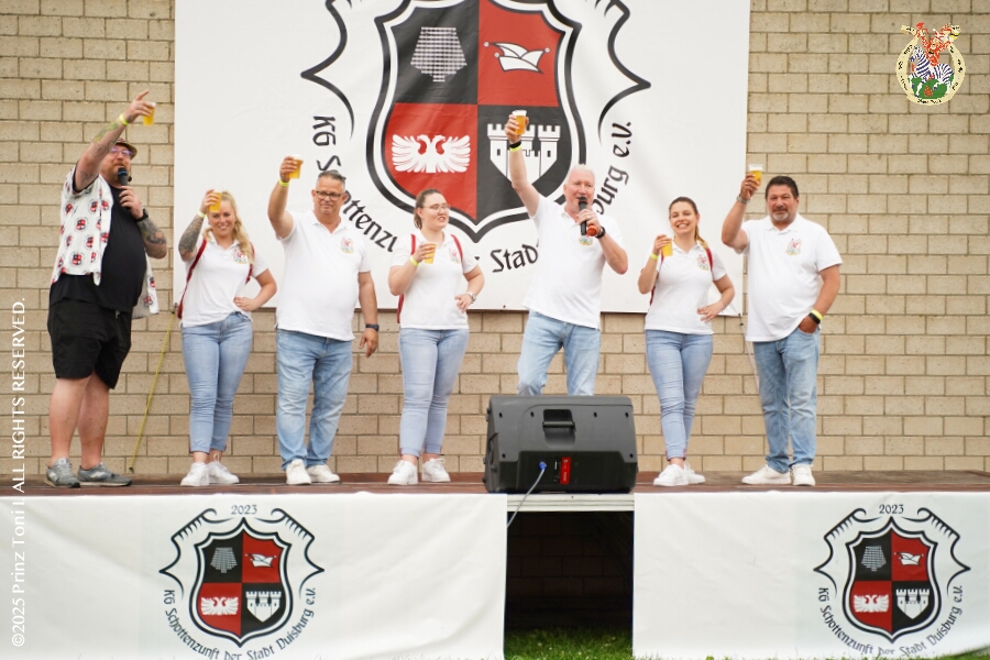 22 Ein schöner und warmer Tag, der 14. Juni - Der Startschuss zur Samstagstour fiel um Mittagszeit im Innenhafen. Wir besuchten die 24. Duisburger Drachenboot Fun-Regatta. Daumen drücken für die Aqua-Garde, ein Boot voller Karnevalisten. Danach besuchten wir das 2. Sommerfest KG Schottenzunft Dusiburg auf der Sportanlage des ETUS Bissingheim. Beim dritten Termin, das Sommerfest der Grafschafter Funken auf dem Quartiersplatz in Moers-Asberg, wurde es ein wenig feucht von Oben, „Abkühlung“. Zurück in Serm überraschten wir Rita und Peter Ambrosius auf der Feier ihre goldenen Hochzeit.