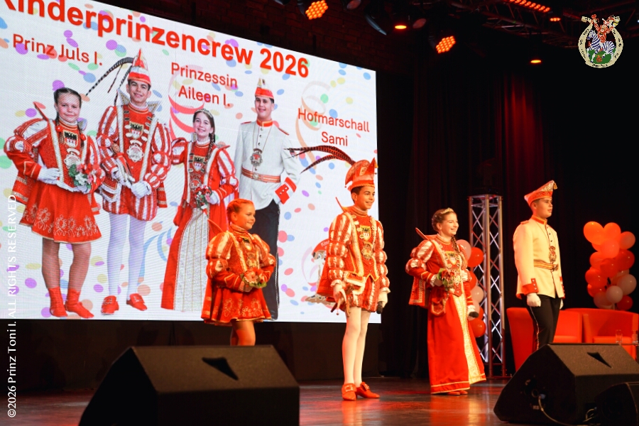 1 Kinderprinzencrew wurde gekürt - Es gehört schon zur Tradition, das am Sonntag vor der Inthronisierung des Stadtprinzen, die Kürzung der Kinderprinzencrew statt findet. Diesmal der 4. Januar 2026 und es gab eine Premiere. Im so genannten „Gürzenich“ von Duisburg, dem Steinhof in Huckingen, wurden Prinz Juls I., Prinzessin Aileen I. mit Hofmarschall Sami und Pagin Paula der Stadt Duisburg 2026 inthronisiert.