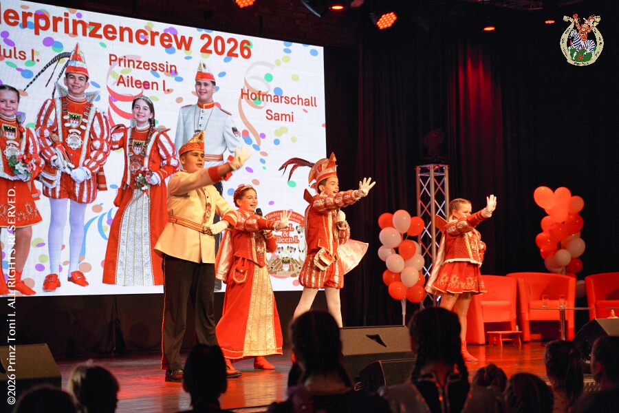 9 Kinderprinzencrew wurde gekürt - Es gehört schon zur Tradition, das am Sonntag vor der Inthronisierung des Stadtprinzen, die Kürzung der Kinderprinzencrew statt findet. Diesmal der 4. Januar 2026 und es gab eine Premiere. Im so genannten „Gürzenich“ von Duisburg, dem Steinhof in Huckingen, wurden Prinz Juls I., Prinzessin Aileen I. mit Hofmarschall Sami und Pagin Paula der Stadt Duisburg 2026 inthronisiert.