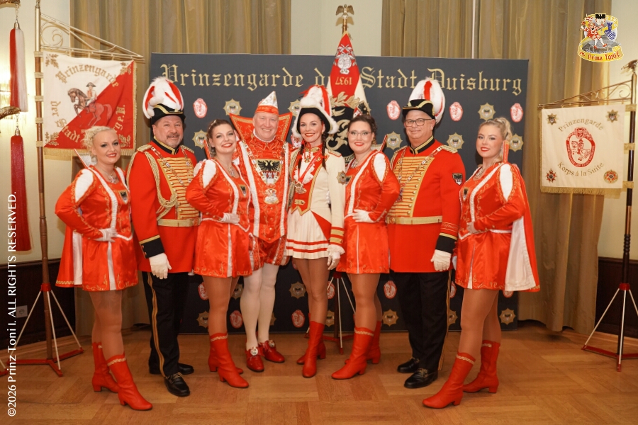 9 Endlich Karnevalsprinz: Toni I. - Am Samstag 10. Januar 2026 war es endlich soweit. Kürung se. Tollität Prinz Toni I., im Rahmen eines hochklassigen Galaabends in der ausverkauften Mercatorhalle in Duisburg. Ein stimmungsvoller Abend mit Show, Musik und Tanz. Vorab präsentierte sich die Prinzencrew 2026 im WYNDHAM Hotel Duisburger Hof der Leibgarde se. Tollität, die Prinzengarde der Stadt Duisburg.