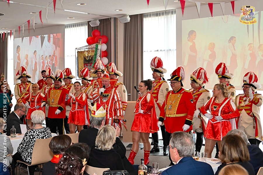 23 Tour-Tag, 1. Februar - Im Intercity Hotel feierten die Roten Funken ihr 77-jähriges Bestehen an diesem Sonntagmorgen, auch wir gratulierten. Auf zum Heimspiel für unsere Christin hieß es danach, dies bei der Damensitzung der » Blauen Jungs «. Eine große Kinderschar erwartete uns dann im Steinhof. Die Musketiere hielten dort ihre Kindersitzung ab. In die Rheinhausenhall führte uns dann der nächste Termin, Damensitzung von Rot-Weiß. Zum Schluß erwartete und die SPD Großenbaum/Rahm bei ihrem „Tanztee“ in unserem Stadquartier, dem Coupe 1900.