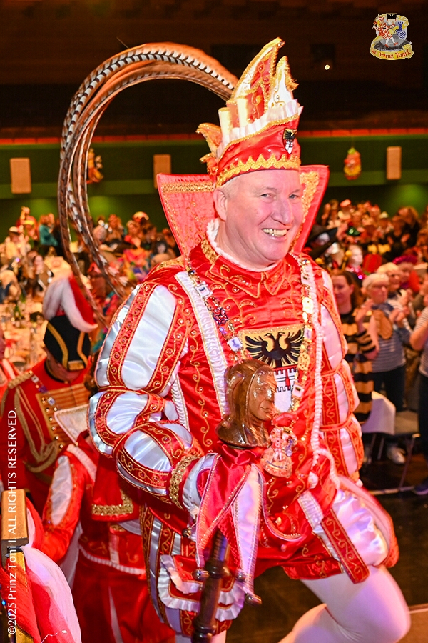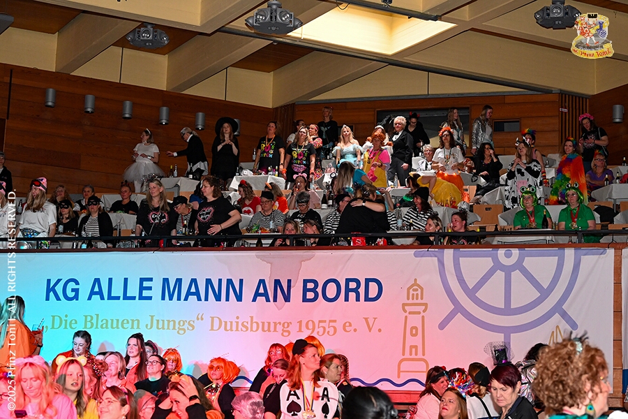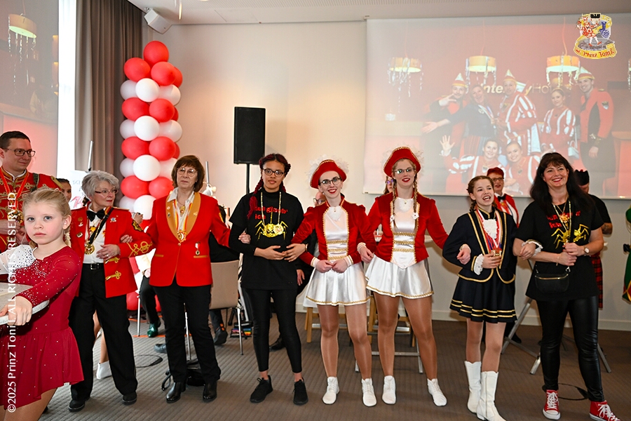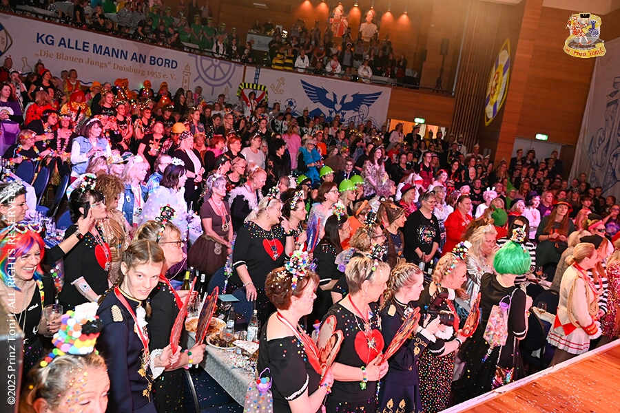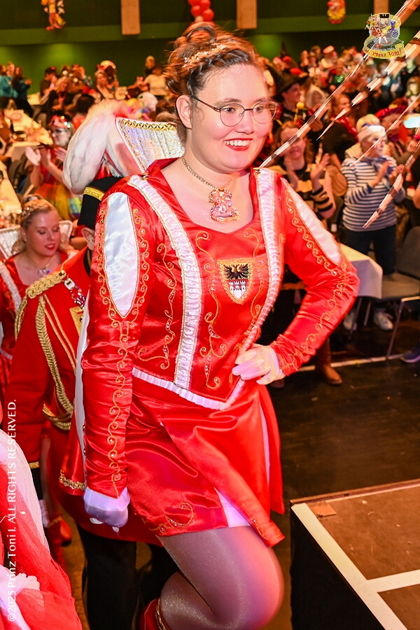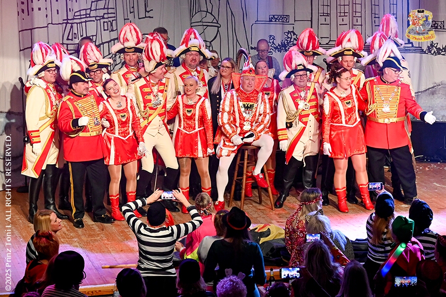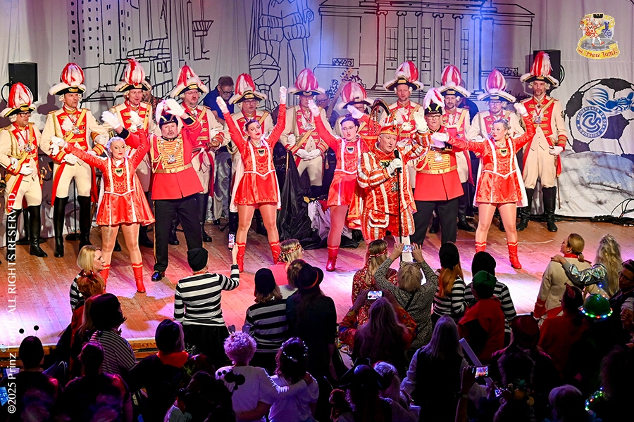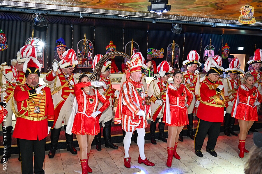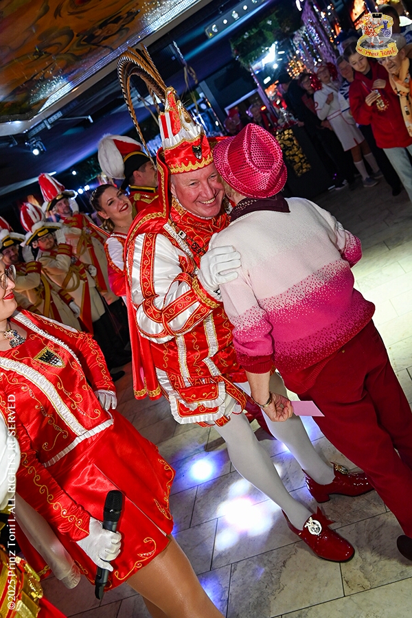 25 Tour-Tag, 1. Februar - Im Intercity Hotel feierten die Roten Funken ihr 77-jähriges Bestehen an diesem Sonntagmorgen, auch wir gratulierten. Auf zum Heimspiel für unsere Christin hieß es danach, dies bei der Damensitzung der » Blauen Jungs «. Eine große Kinderschar erwartete uns dann im Steinhof. Die Musketiere hielten dort ihre Kindersitzung ab. In die Rheinhausenhall führte uns dann der nächste Termin, Damensitzung von Rot-Weiß. Zum Schluß erwartete und die SPD Großenbaum/Rahm bei ihrem „Tanztee“ in unserem Stadquartier, dem Coupe 1900.