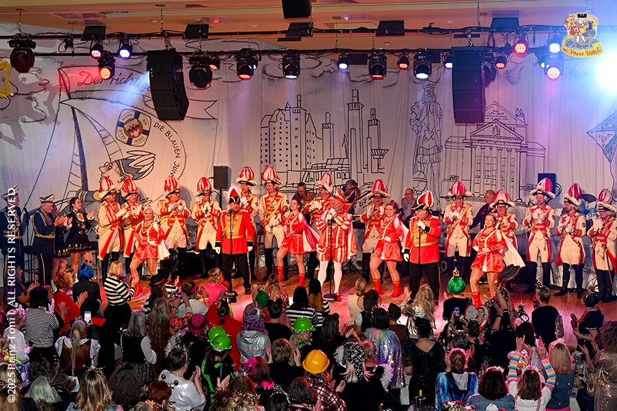 22 Tour-Tag, 1. Februar - Im Intercity Hotel feierten die Roten Funken ihr 77-jähriges Bestehen an diesem Sonntagmorgen, auch wir gratulierten. Auf zum Heimspiel für unsere Christin hieß es danach, dies bei der Damensitzung der » Blauen Jungs «. Eine große Kinderschar erwartete uns dann im Steinhof. Die Musketiere hielten dort ihre Kindersitzung ab. In die Rheinhausenhall führte uns dann der nächste Termin, Damensitzung von Rot-Weiß. Zum Schluß erwartete und die SPD Großenbaum/Rahm bei ihrem „Tanztee“ in unserem Stadquartier, dem Coupe 1900.