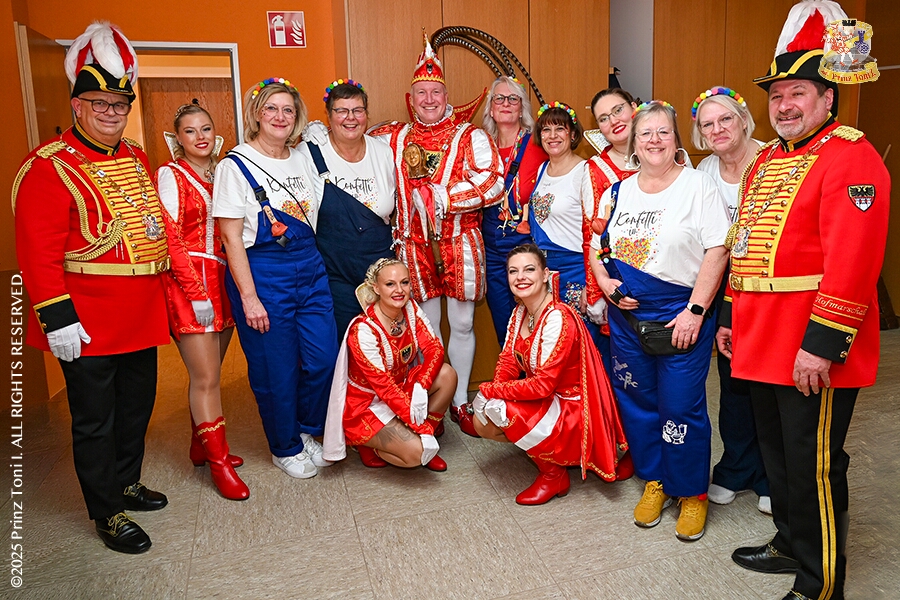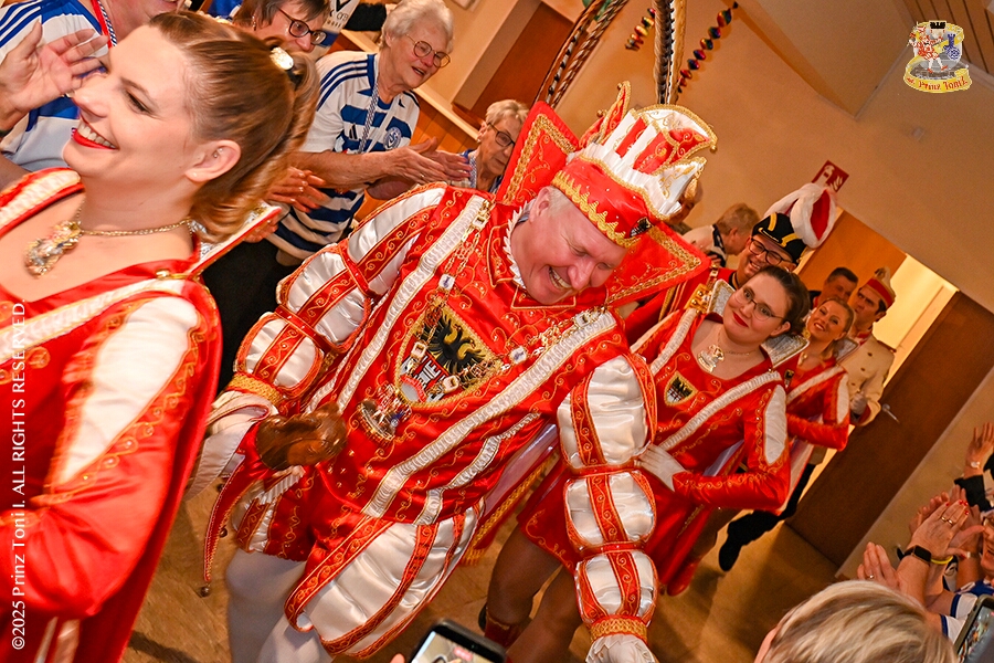 6 Seniorenkarneval und Flüstersitzung - An Nachmittag des 4. Februar führte uns der erste Termin in das DRK-Multikulturelle Seniorenzentrum Haus am Sandberg in Homberg. Zum 2. Termin musste wir in den Süden. In Huckingen feierte die KFD St. Peter und Paul Gemeinde ihren 2. karnvalistischen Nachmittag, Toni I. wurde ein Superstar empfangen. Gestärkt mit ausreichend Kuchen und Kaffee ging es dann nach Walsum. In Open Rheins „Zum Johanniter“ , dort fand die „Flüstersitzung“ der Prinzengarde statt.