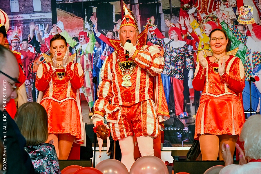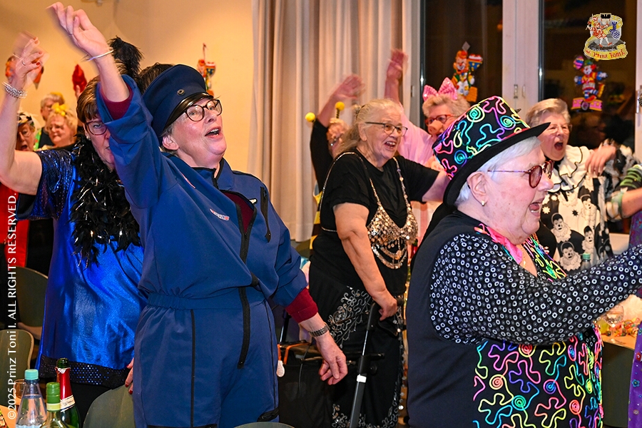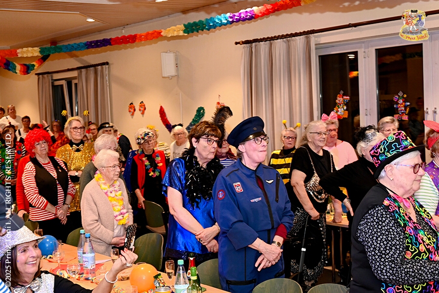 3 Seniorenkarneval und Flüstersitzung - An Nachmittag des 4. Februar führte uns der erste Termin in das DRK-Multikulturelle Seniorenzentrum Haus am Sandberg in Homberg. Zum 2. Termin musste wir in den Süden. In Huckingen feierte die KFD St. Peter und Paul Gemeinde ihren 2. karnvalistischen Nachmittag, Toni I. wurde ein Superstar empfangen. Gestärkt mit ausreichend Kuchen und Kaffee ging es dann nach Walsum. In Open Rheins „Zum Johanniter“ , dort fand die „Flüstersitzung“ der Prinzengarde statt.